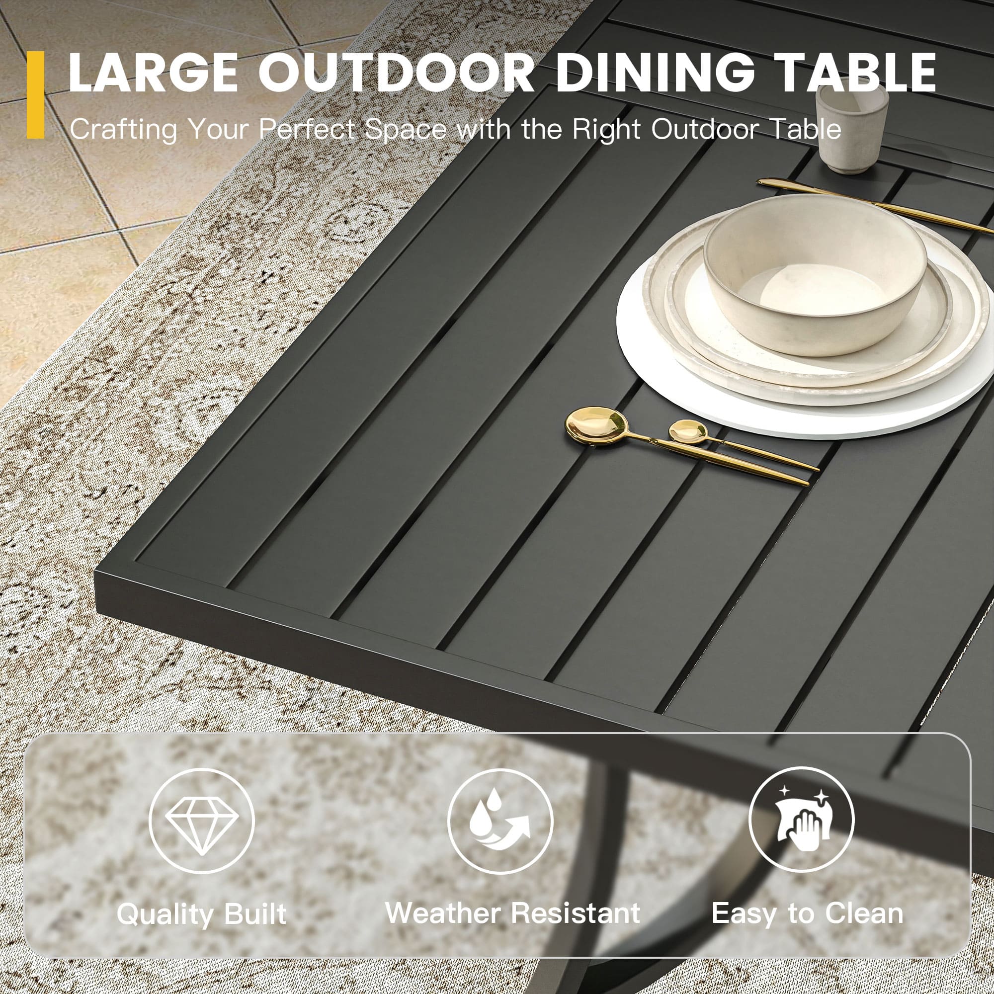 - 【Metal Slatted Table Top】Simple and stylish slatted tabletop design, with a special powder coating treatment, the large dining table has good applicability and weather resistance.